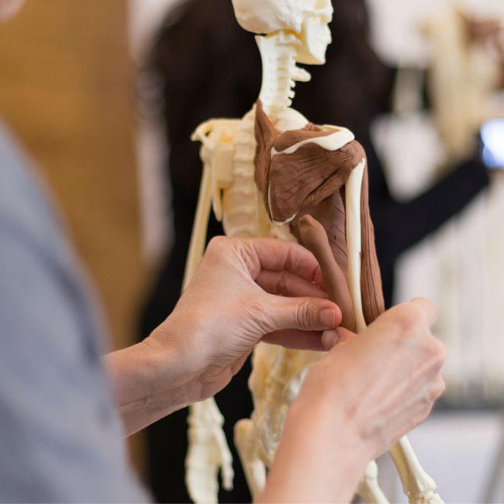 Build the body from the inside out with clay on a specially-designed skeleton. There is no better way to learn anatomy! Understand the structure and function of bones, joints, muscles, tendons and ligaments as well as the origin, insertion and action of the major muscles by building them yourself on the Anatomy + Movement skeleton.