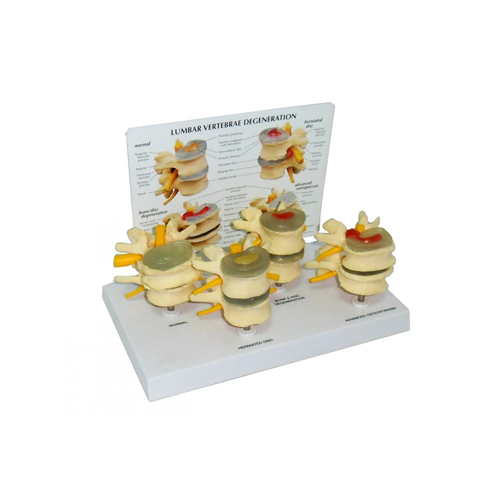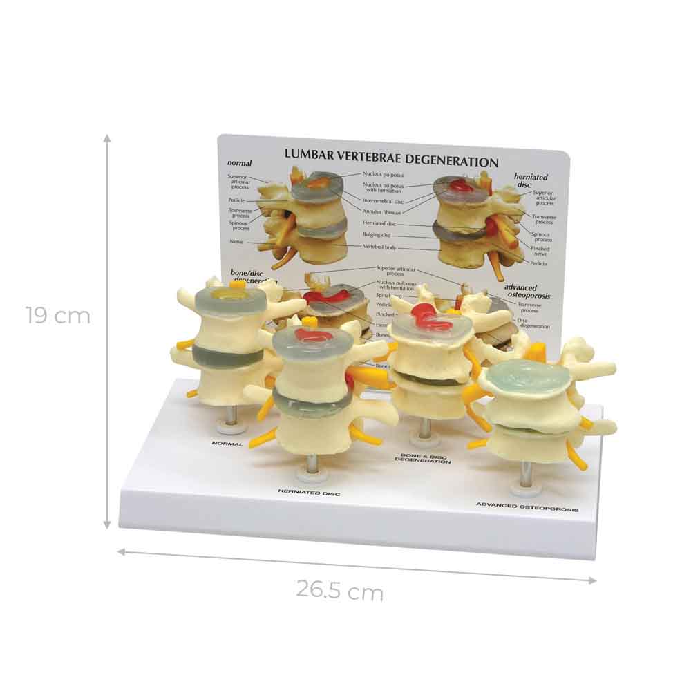 The Degenerative 4 Stage Vertebrae Model reflects the classification of the differences between a bulging disc, variances of herniated discs, protruded and extruded discs, and degenerated or desiccated discs. The Degenerative 4 Stage Vertebrae Model consists of four pairs of vertebrae, each containing an intervertebral disc demonstrating varying pathologies. The Degenerative 4 Stage Vertebrae Model features four life-size, two-piece lumbar vertebrae models in different stages of degeneration.