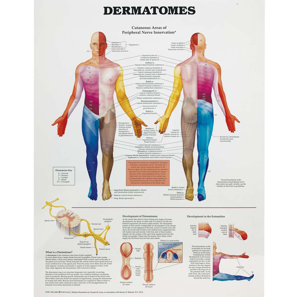 This dermatomes poster defines the human dermatomes in beautiful colour illustrations. Dermatomes provide a way to map the approximate areas of skin on the body that is supplied by nerves from a single spinal root.