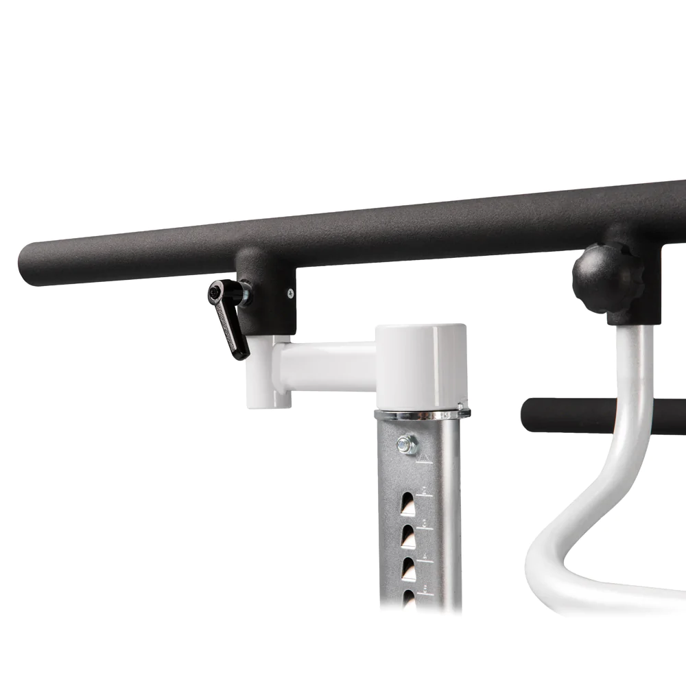 The removable parallel bars offer handrail support for added patient safety. Adjustments can also accommodate users of various heights and fitness abilities. Bars adjust 25 to 35 inches in height, 20 to 31 inches in width, and the length extends to the full length of the deck.