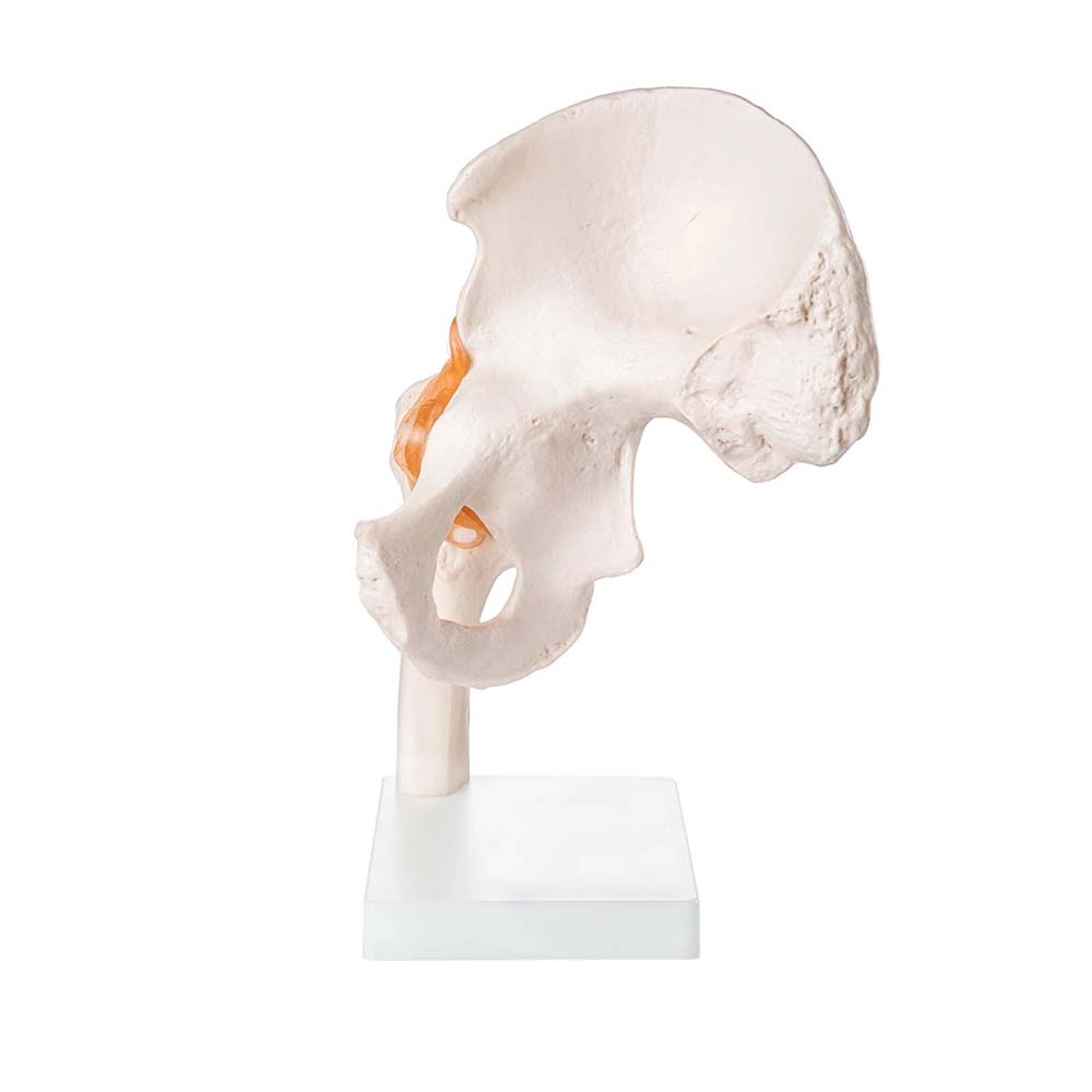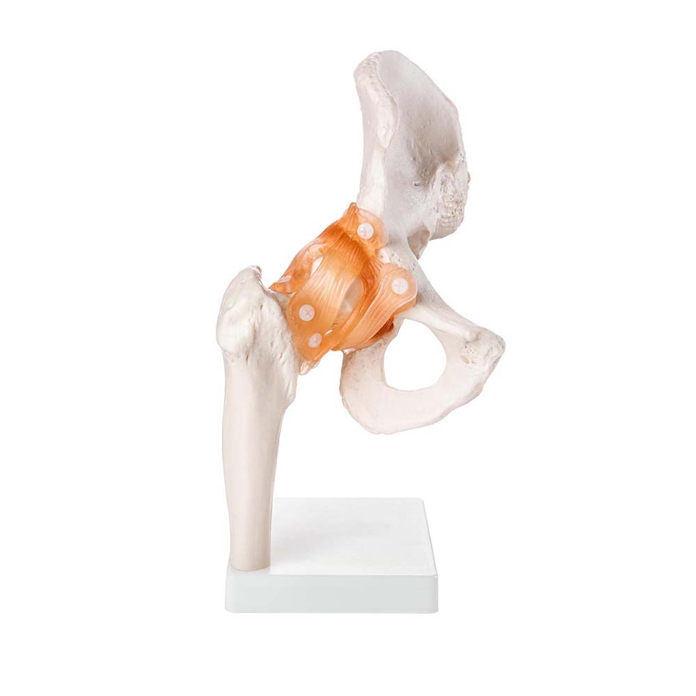The model consists of the upper portion of the femur and the pelvis bone, allowing for the demonstration of the interaction of the femur head in the hip socket (acetabulum). The pubofemoral, ischiofemoral and iliofemoral ligaments are represented and can be removed from the model.