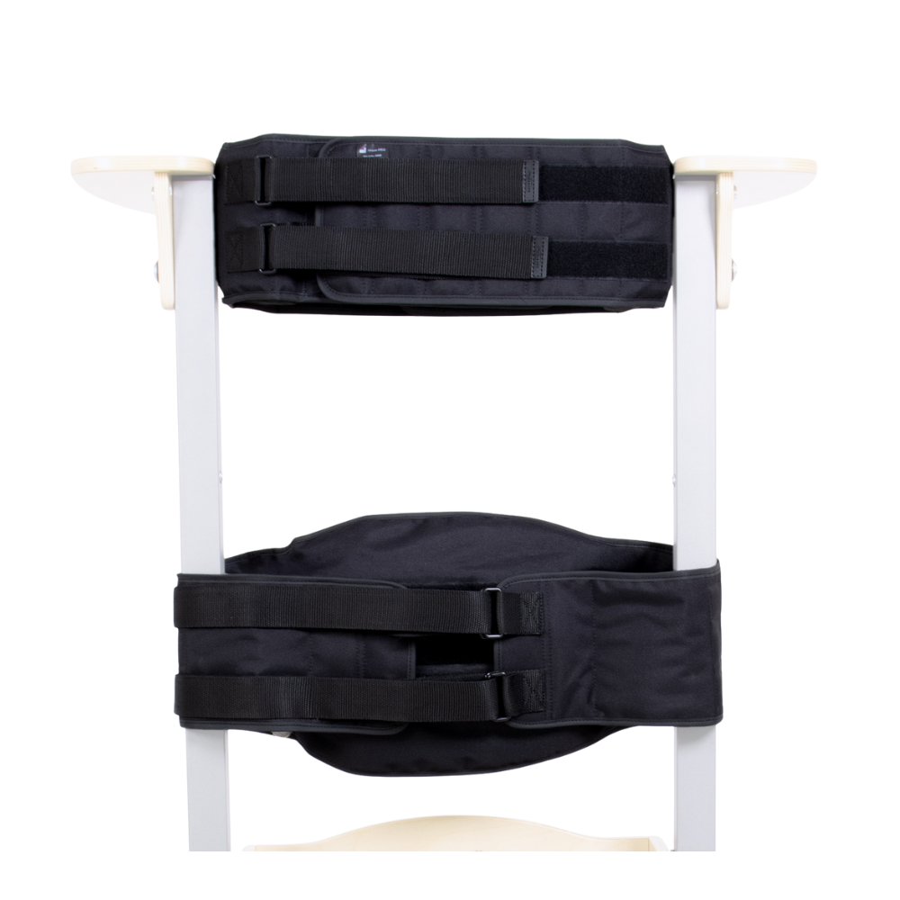 Additionally, the adjustment of knee supports and the height of the standing frame is now done in a smooth and stepless way, allowing quick adaptation of the stander to the user’s individual needs. The innovative UPRIGHT PRO™ system consists of a chest and pelvic belt, offering broad adjustment possibilities. Strong Velcro straps used in the belts guarantee stability, safety, and easy, quick adjustment. The hip belt features a clever design, enabling better control over pelvic rotation and correcting the user’s position in the frontal plane through smooth lateral pelvic shifting (to the right or left), according to individual needs.