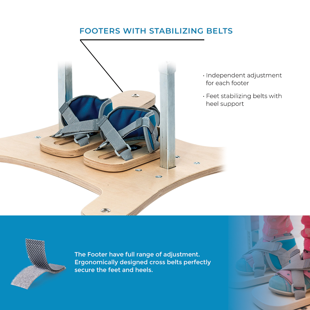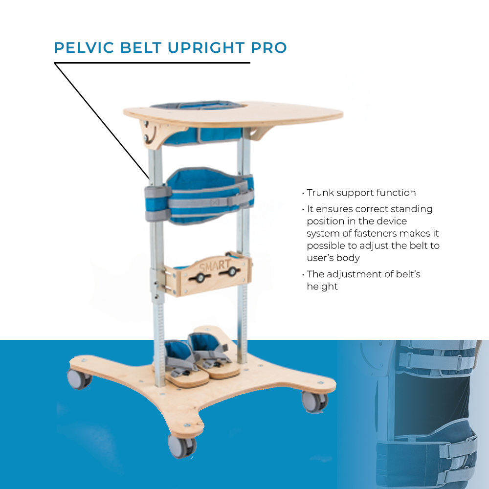 • Adjustable chest and pelvic support system — Uses Akces-Med’s “UPRIGHT PRO” system, consisting of chest and pelvic braces with a very wide range of adjustment, which helps achieve a correct and comfortable standing posture.