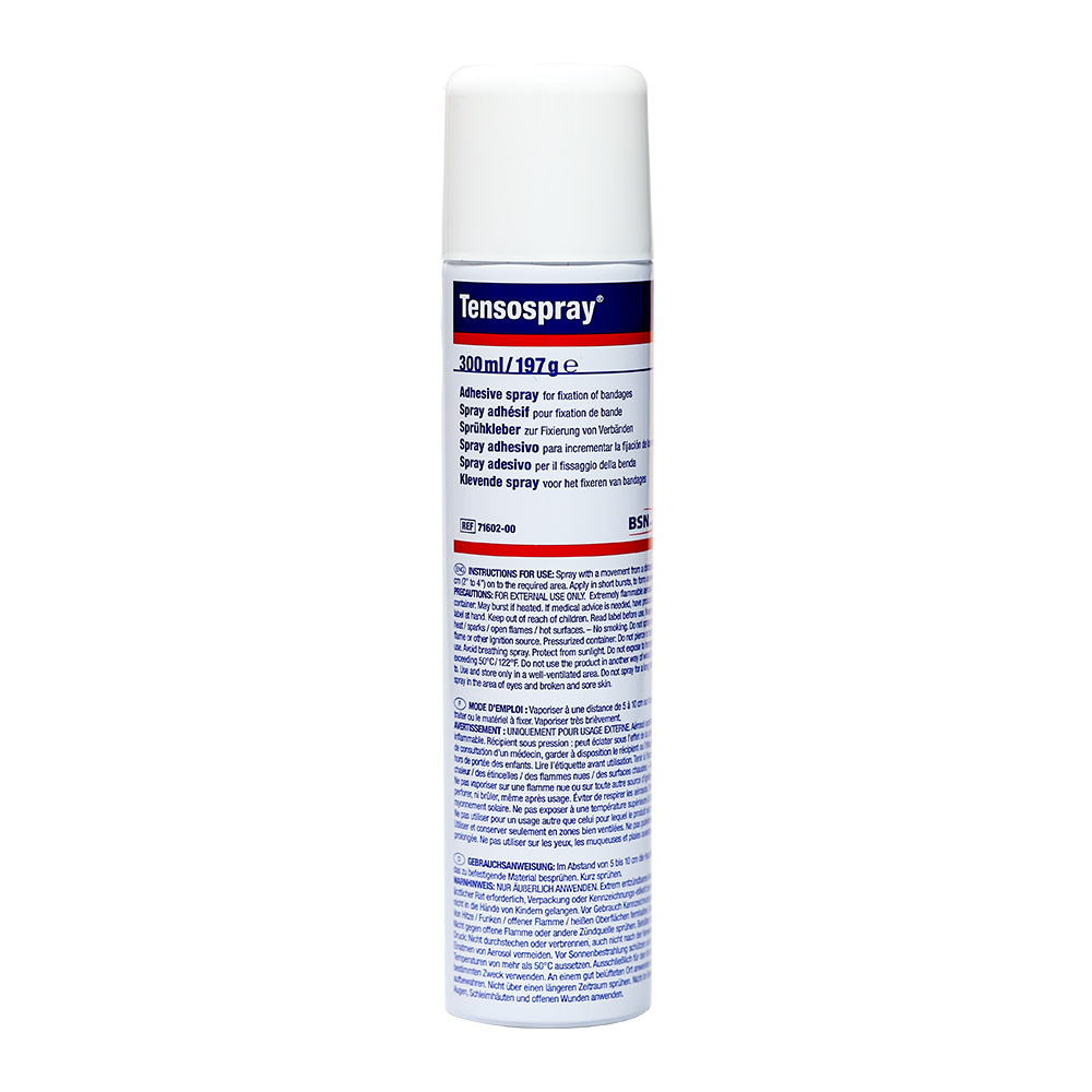 Tensospray is a convenient clear spray which leaves a thin protective film over the surface of the skin. This provides an ideal layer for adhesive bandages and tapes, promoting excellent adhesive traction and reducing skin trauma on removal. Designed for use before the application of pre-wrap, tape or elastic adhesive bandages.