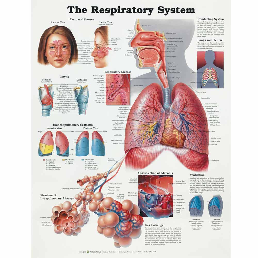 This laminated respiratory system poster by the Anatomical Chart Company provides a great introduction to the anatomy of the lungs. Covering the complete respiratory system from the frontal sinus to the diaphragm.