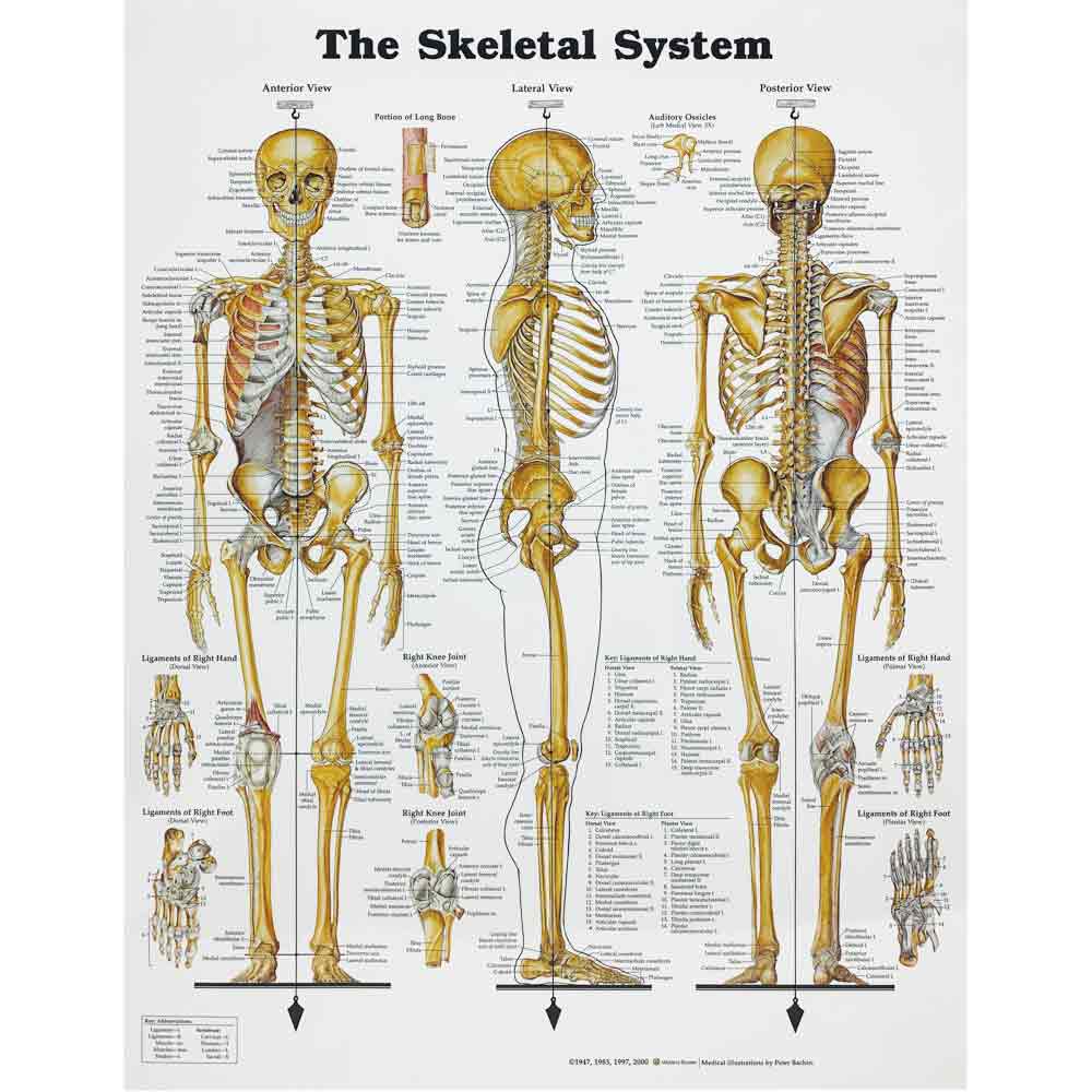 This skeletal system chart is ideal for teaching or learning the anatomy of the human skeleton at all levels. All of the muscles of the human body and numbered and named, and a key on the Skeletal System provides further anatomical nomenclature.