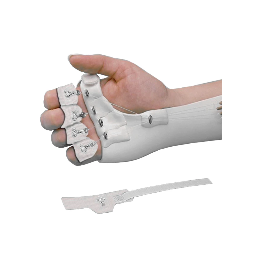 Wrap-On Finger Hooks are an alternative to glueing hooks onto fingernails. They are great for use with burn patients and amputees as well as people with sensitive nail beds and general hand trauma. The thin strapping material is lined with slip-resistant material to help prevent migration. Hooks secure to fingertips with a hook strap and are sized for large fingers; trim to fit any size.